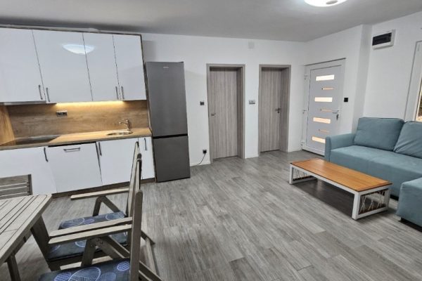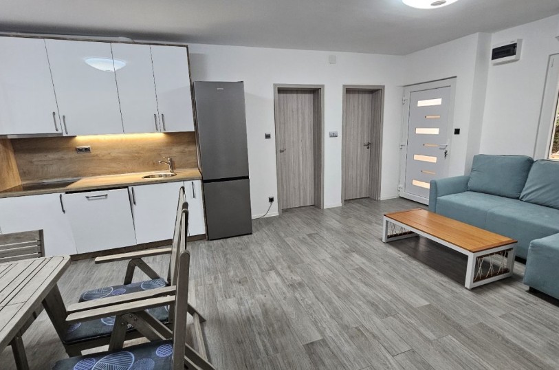 Two-bedroom apartment has 60 m² and can accommodate up to 6 people and consists of 2 separate bedrooms with access to a balcony, a large living room with a kitchen and a dining room, a bathroom with a toilet, another separate toilet and a stone terrace.