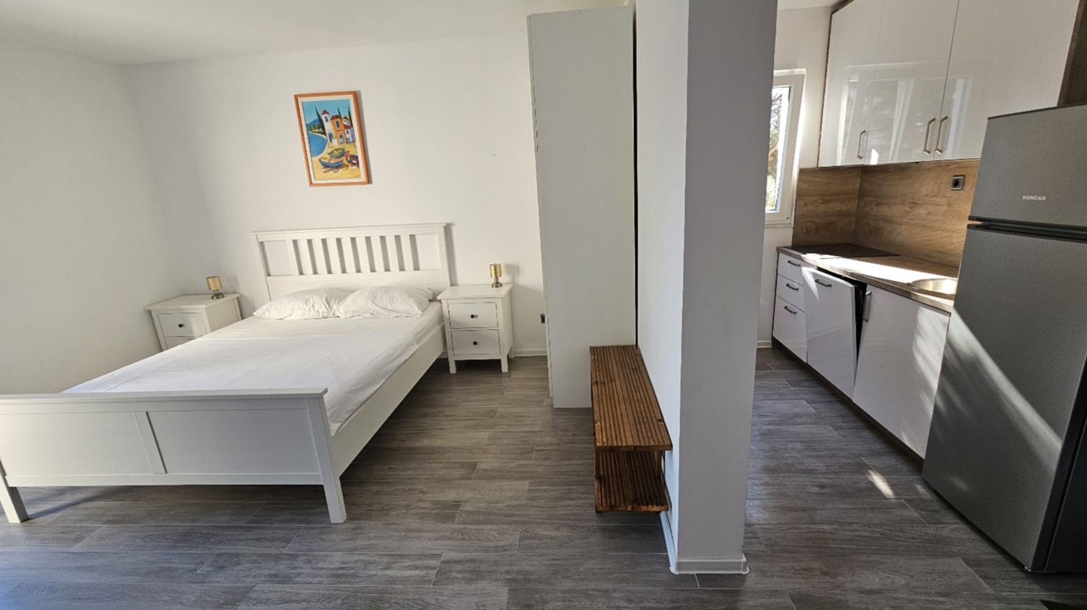 Studio has 30 m² and can accommodate up to two people and is equipped with a double bed, a sofa bed, a kitchen, a bathroom and a large terrace.